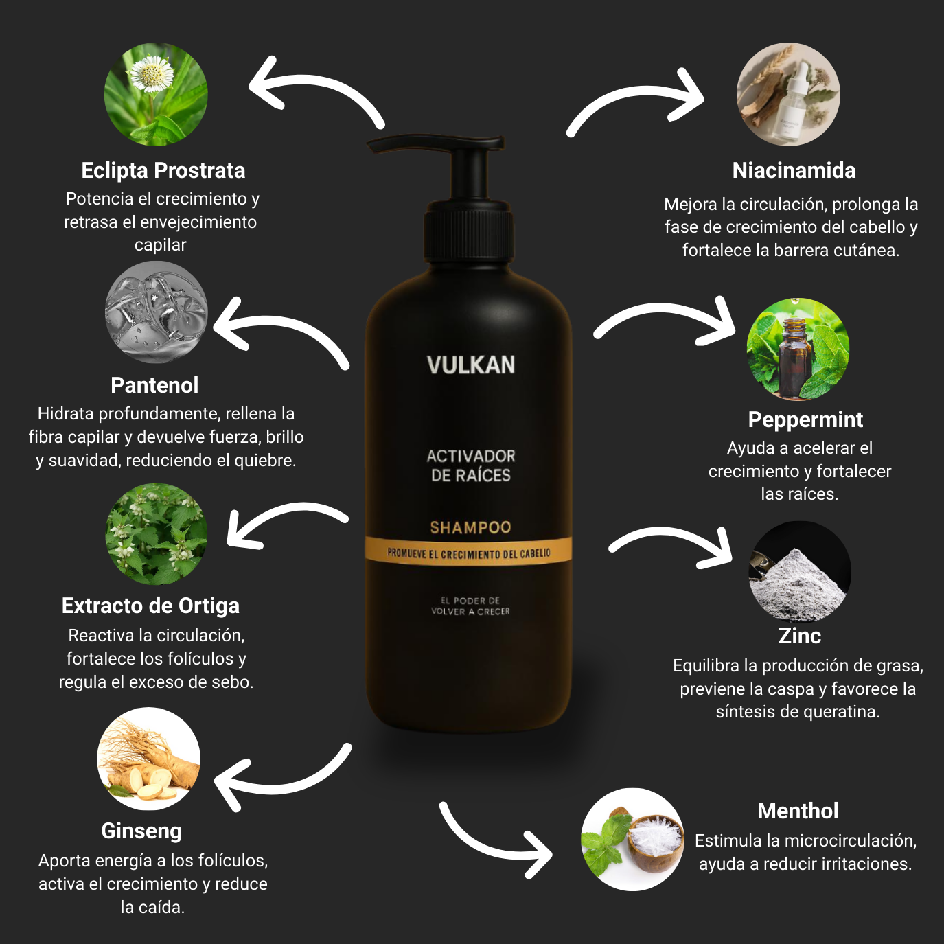 Descubrí la fórmula avanzada de VULKAN™ Activador de Raíces, diseñada para estimular el crecimiento natural del cabello y fortalecerlo desde adentro. Con extractos botánicos, vitaminas y activos clínicamente probados, nutre el cuero cabelludo, detiene la caída y potencia la densidad capilar.